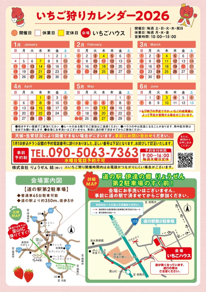 株式会社りょうぜん結 は1月10日(土)より、道の駅第2駐車場近くの「イチゴハウス」でいちご狩りをスタートします。