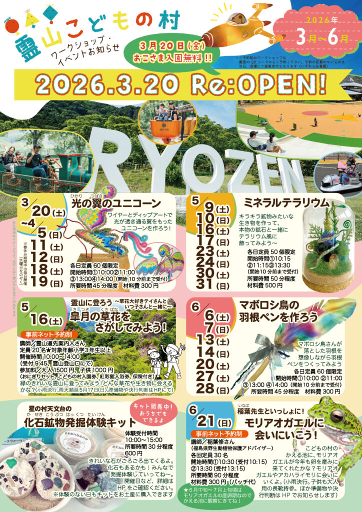 3月20日再オープンの霊山こどもの村から、2026年春期間(3月〜6月)のイベント・ワークショップをお知らせします。